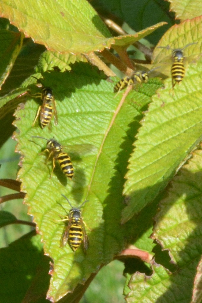 One mid-morning this summer I was weeding by the viburnum in the front yard and found the air filling with yellow and black insects. I backed away slowly. After a few hours, when they were visible but not agitated, I slowly and quietly returned to retrieve my garden tools and camera, and saw I’d been working inches from the Yellowjackets’ ground nest. I ceded the area to them for the rest of the summer.