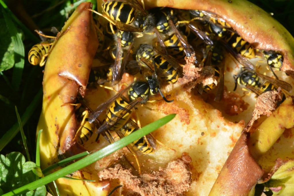 With the help of iNaturalist and Bugguide.net, I identified them as Vespula maculifrons, a Ground Yellowjacket also known as the Eastern Yellowjacket. According to Bugguide, they are the most abundant Yellowjacket species east of the Great Plains. The adults feed on nectar and the juice of ripe and rotting fruit. As it happens, I first identified this species years ago when I rented a house with a big apple tree in the backyard and couldn’t keep up with the fallen apples. Yellowjackets of several species appreciated the bounty, including Vespula germanica, the German Yellowjacket, just left of center in this photo.
