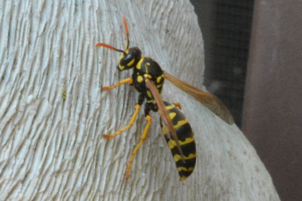 Meanwhile, in the backyard, wasps nested, European Paper Wasps, Polistes dominula. Oddly enough, in a bluebird-shaped birdhouse that I’d left on the back deck.